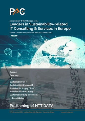 NTT DATA a obtenu la plus haute désignation de PAC dans trois catégories spécifiques basées sur ses compétences et sa force de marché dans le rapport << Leaders in Sustainability Related IT Consulting & Services in Europe >> (Leaders dans le conseil et les services informatiques liés au développement durable en Europe) pour 2024. L'entreprise a été classée Best in Class pour la durabilité de l'informatique, les rapports de durabilité et les conseils et services informatiques liés à la durabilité en Allemagne.